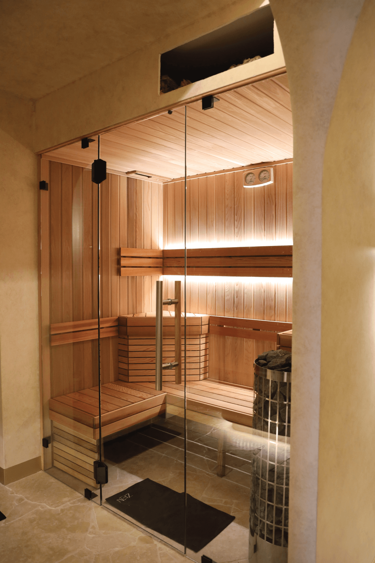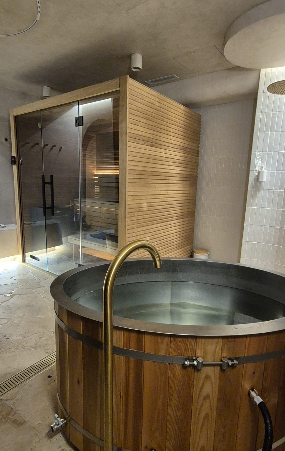 Zens’s contrast therapy room, where we invite you to embark on a 1 hour journey of rejuvenation and revitalization. Our bespoke facility features a custom-made traditional hot rock sauna, a refreshing cold plunge, private shower amenities and entertainment